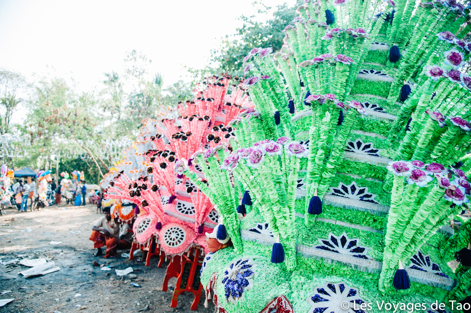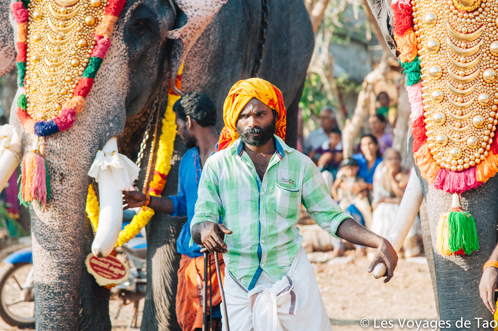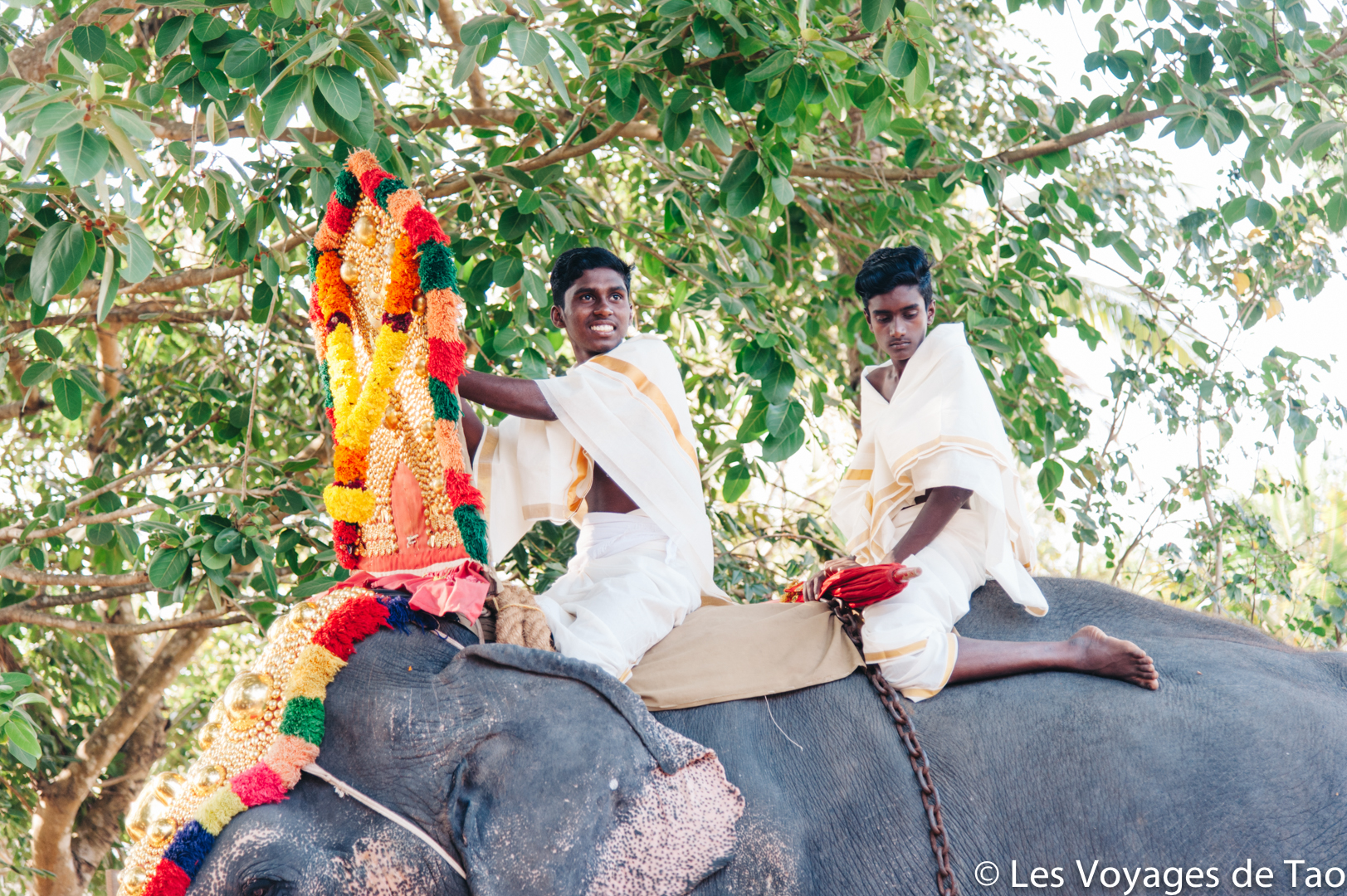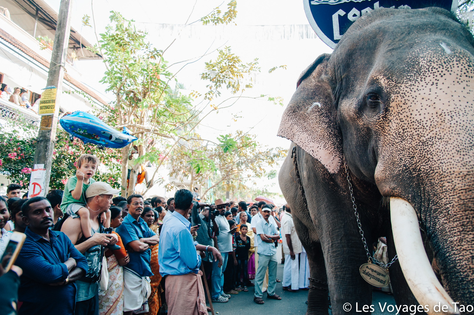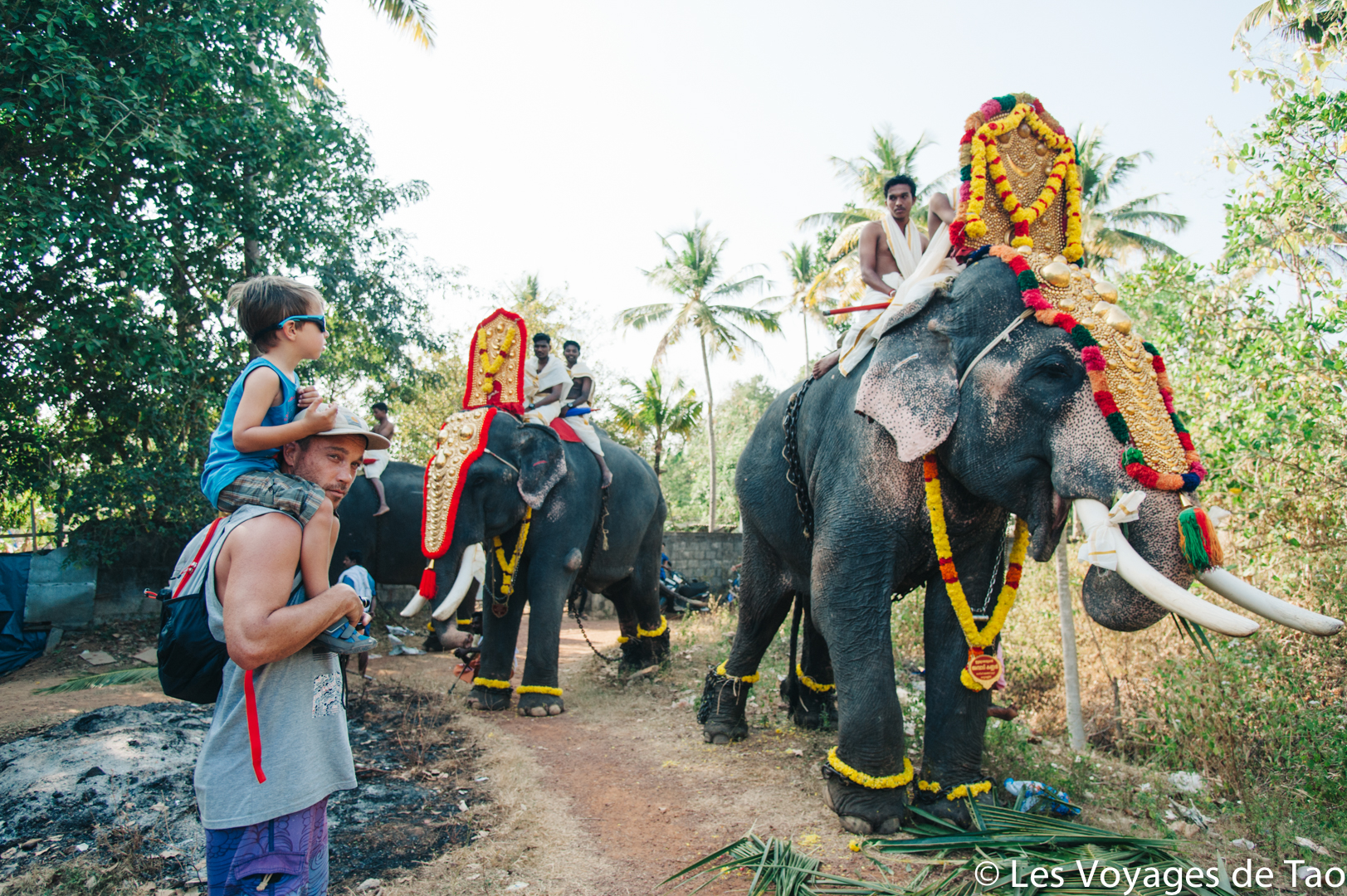 De Varkala nous avions pris un tuk tuk pour aller voir des éléphants. Habituellement, nous ne sommes pas fans de ce genre d’endroit, mais on voulait que Tao puisse voir des éléphants. En fait, arrivés à la petite ferme il n’y avait aucun éléphant. Dans le Kerala, il y a beaucoup de fête et ce jour là ils étaient tous à une fête d’un temple. Nous voilà donc parti à la fête et c’était magique.