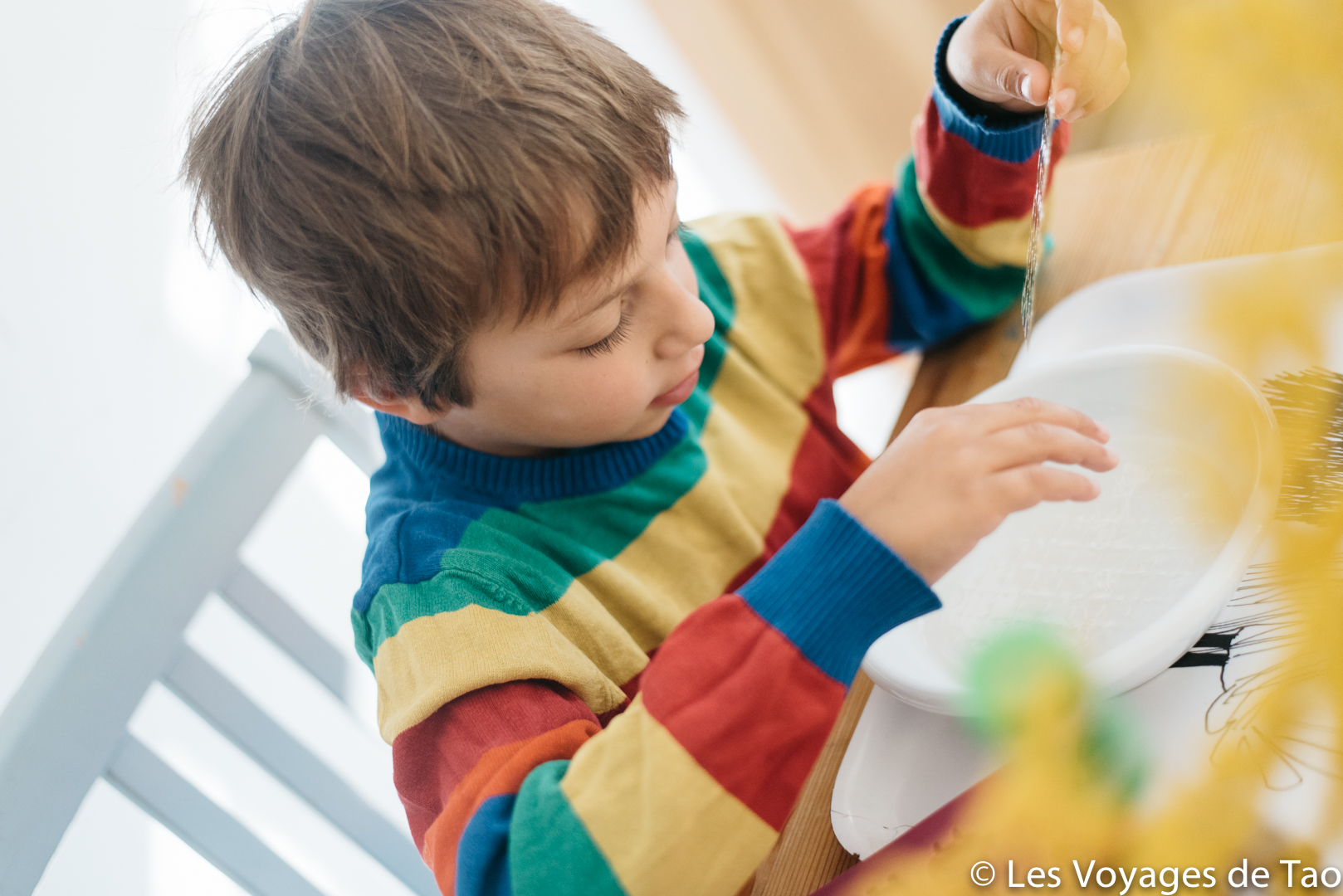 Egoutter la gélatine, verser la préparation chaude dans une assiette afin que votre enfant puisse plonger les feuilles égouttées dans le mélange chaud. Les mélanger pour les faire dissoudre.