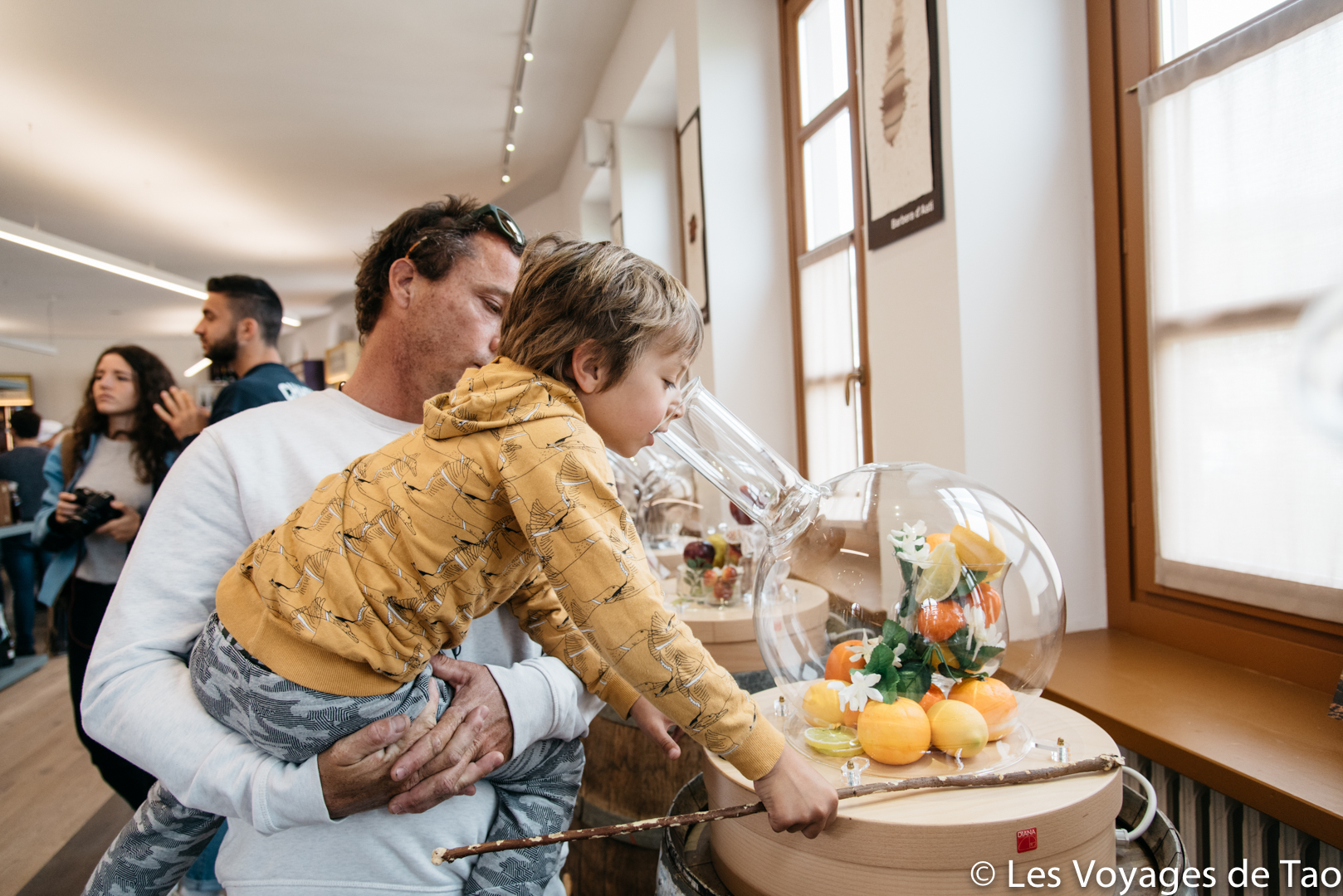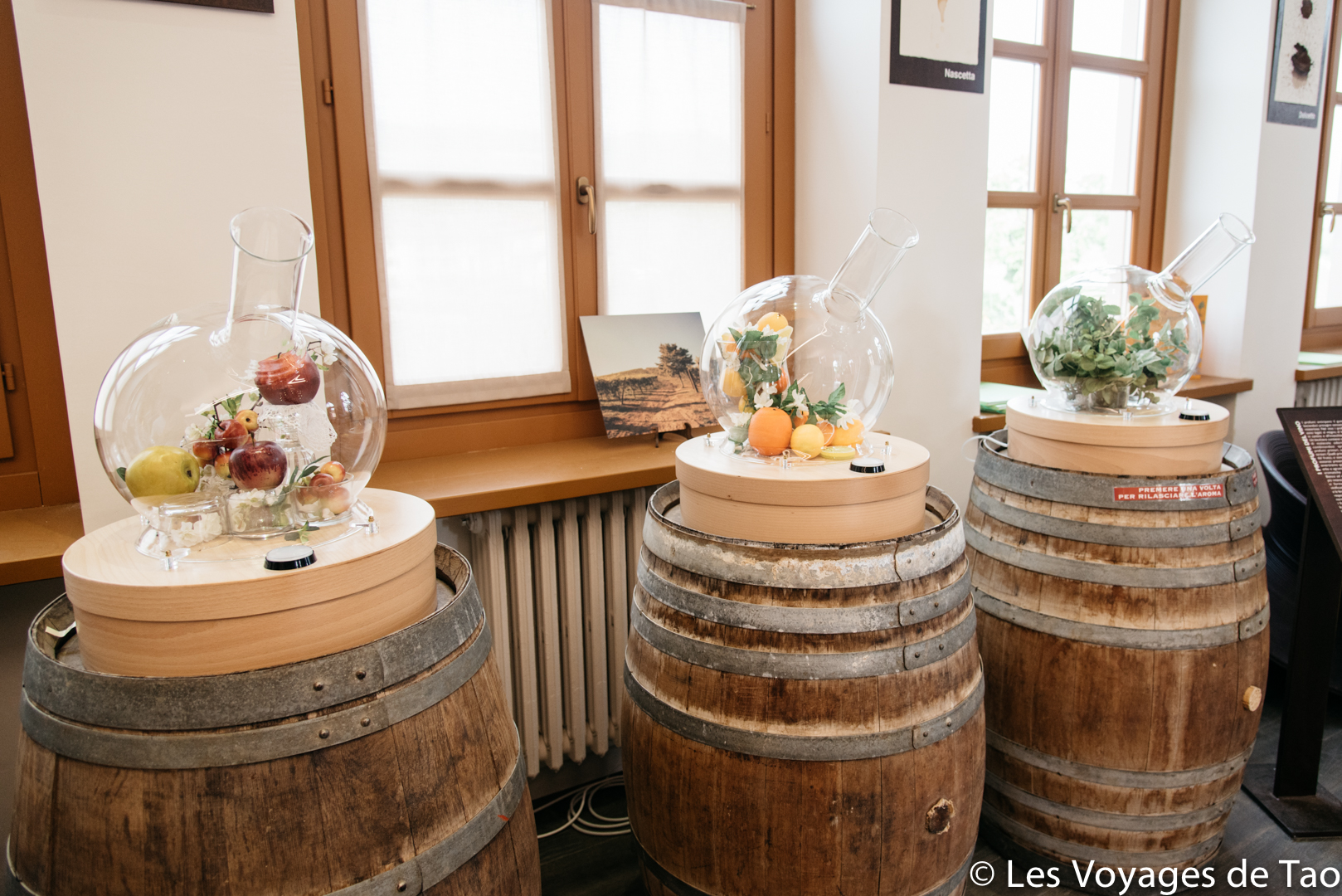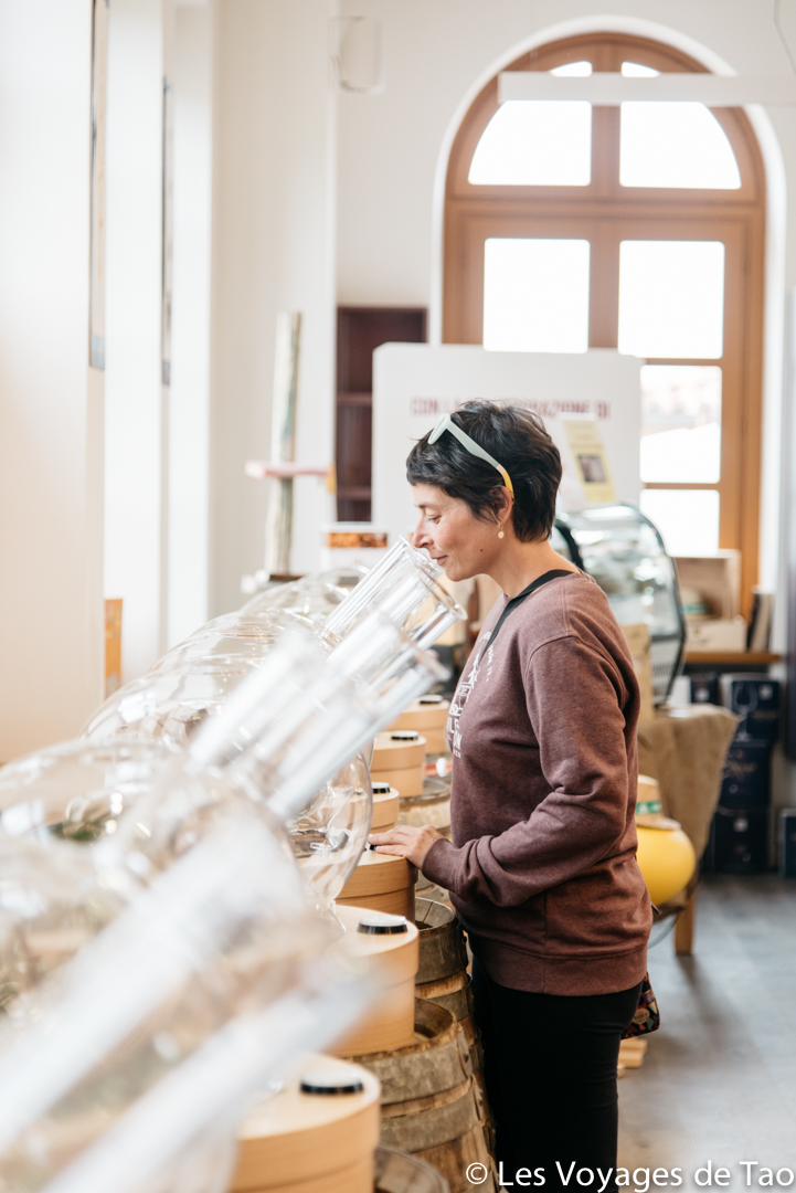 Il y a comme des entonnoirs en verre où vous pouvez sentir la cannelle, le raisin, la fraise,… L’endroit est très joli.