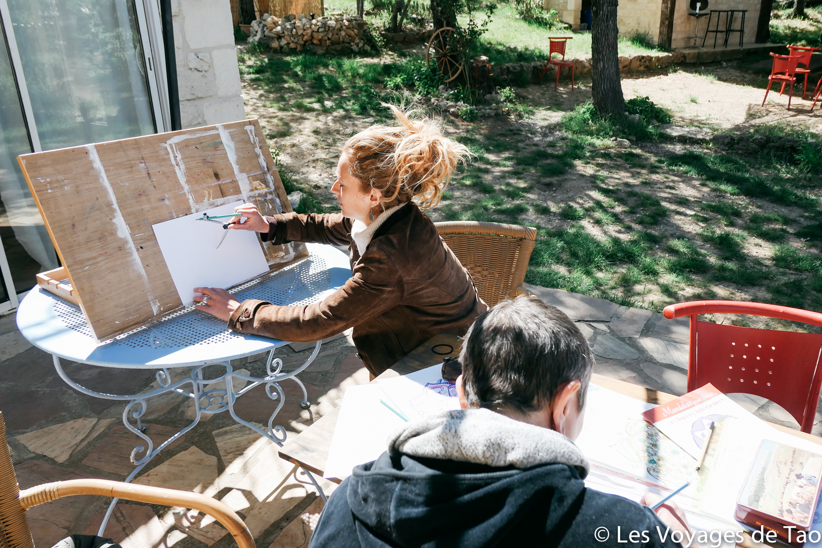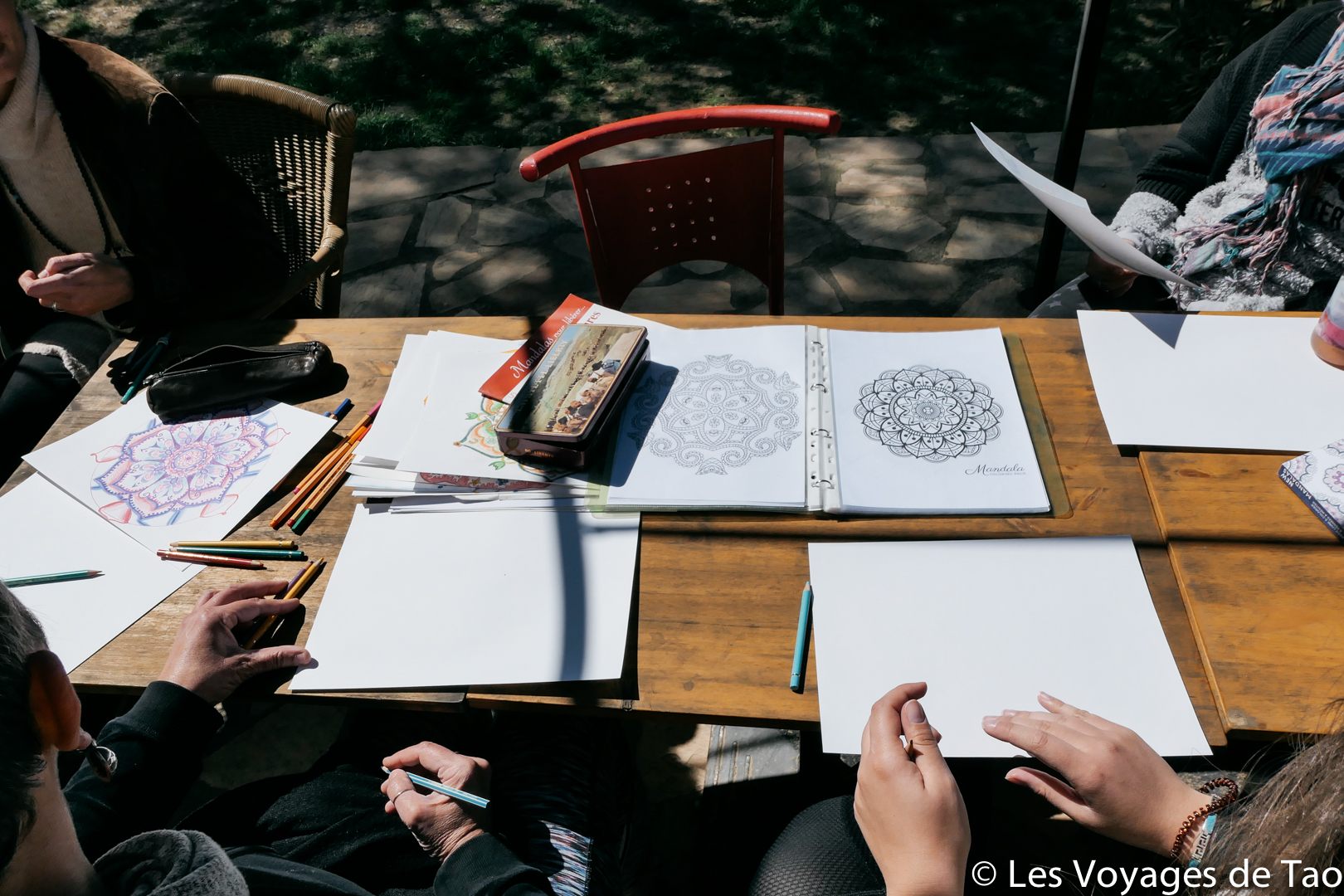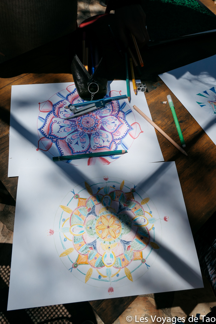Un des autres ateliers proposé était la création de Mandala. Comme tout le monde, j’ai un petit cahier de coloriage de Mandala, je le fais de temps en temps mais j’avoue que j’ai du mal à m’y mettre vraiment. Par contre, créer son mandala a été vraiment plus attrayant pour moi, j’ai vraiment aimé créer le mien, en ayant les explications de Mathilde. Nous avons passé 1 heure dehors à créer tout en papotant au soleil, que du bonheur.