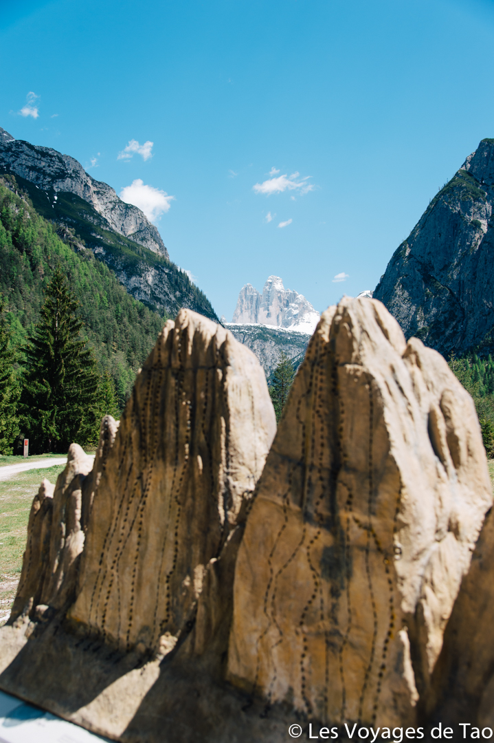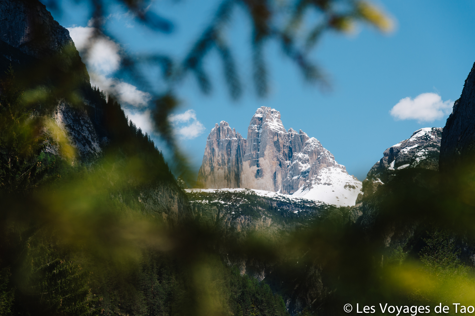 En quittant le lac di Braies en direction du Lac d’Antorno, vous verrez sur la gauche un joli point de vue sur Tre Cime, vous verrez pleins de voitures vous ne pourrez pas vous tromper.
