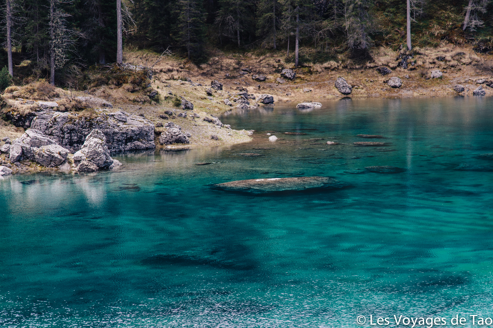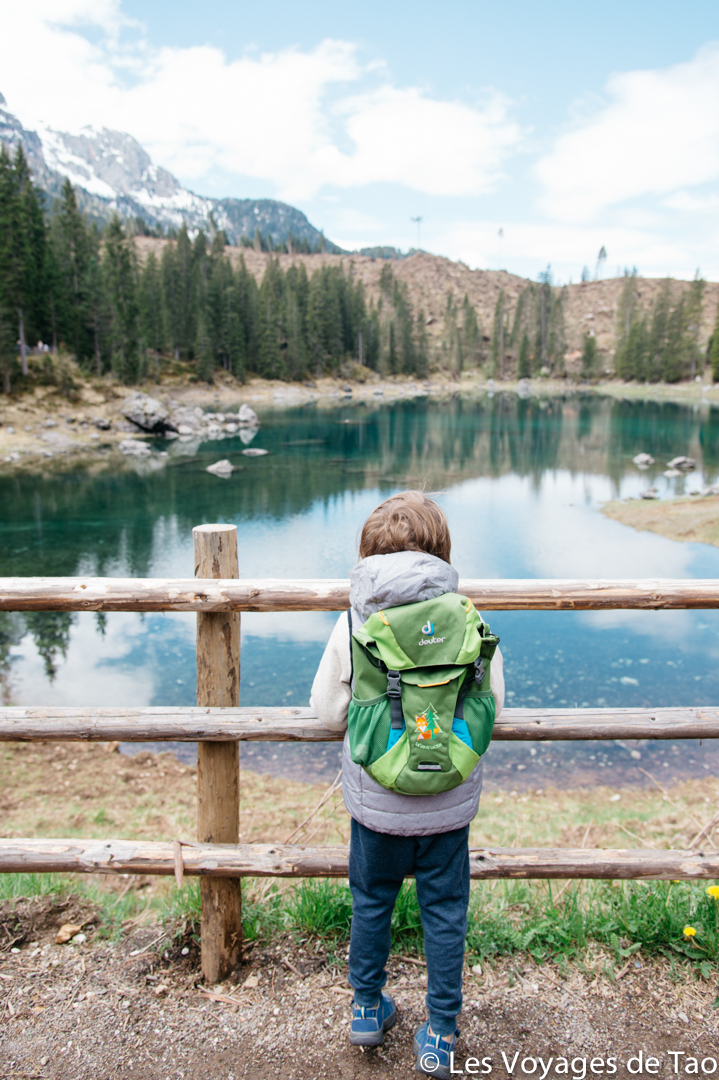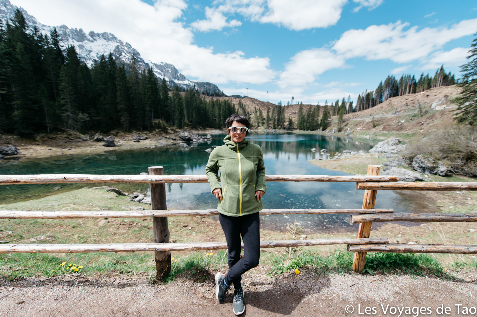 Notre première étape fut donc le Lac de Carrezza (Lac de Karersee) à seulement 40 minutes de Bolzano. Notre première impression fut assez mitigée…. Nous avions vu tellement de photos et de commentaires sur ce lieu que j’avoue qu’en arrivant nous avons été déçus. Le lac est très beau, sa couleur est sublime et la chaine de montagne derrière est magnifique, mais cet endroit ne sera pas parmi nos préférés. La route longe le lac et cela enlève tout son charme…. A voir quand même mais c’est loin de ce que nous avions pu lire à son sujet.