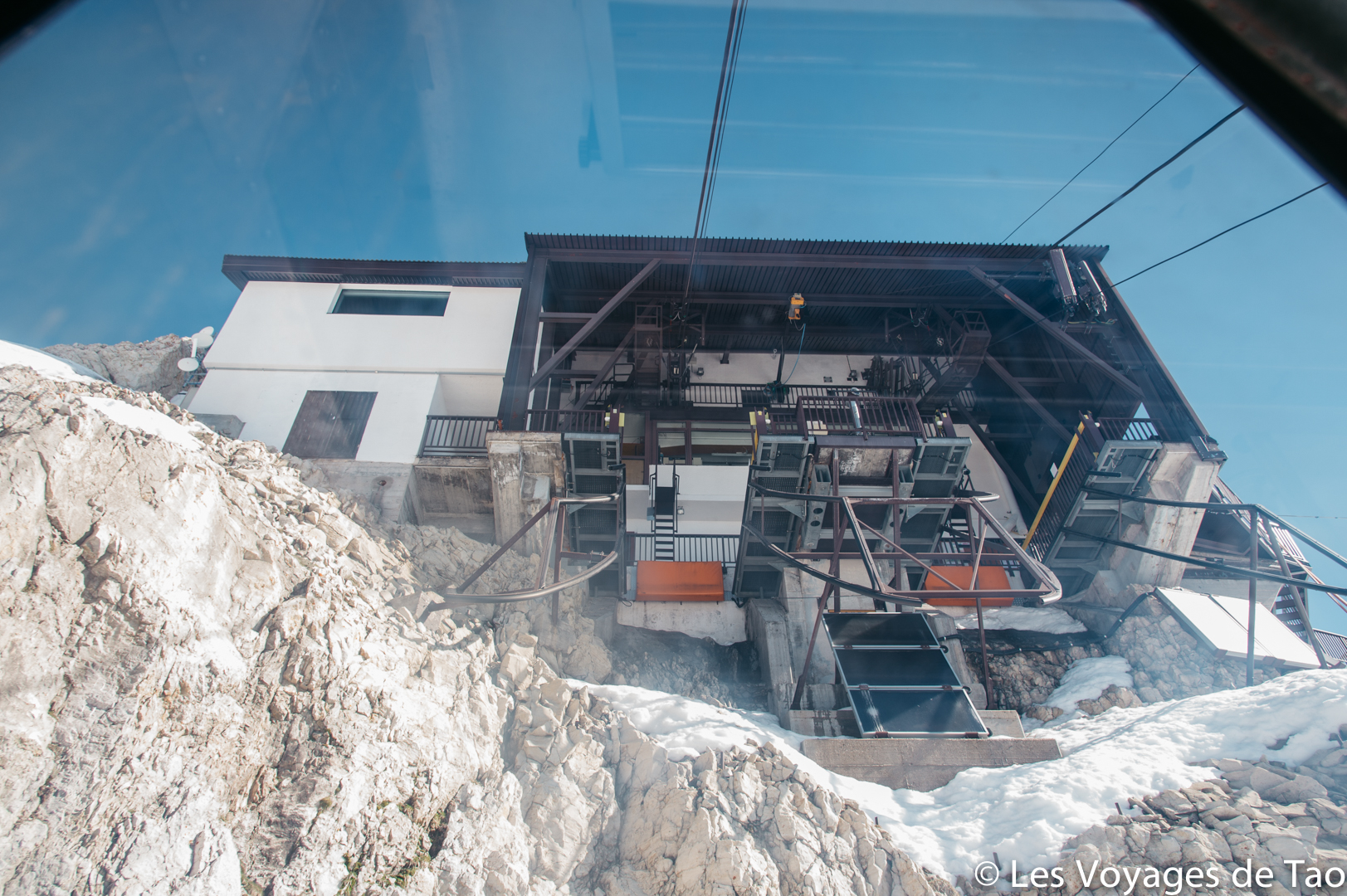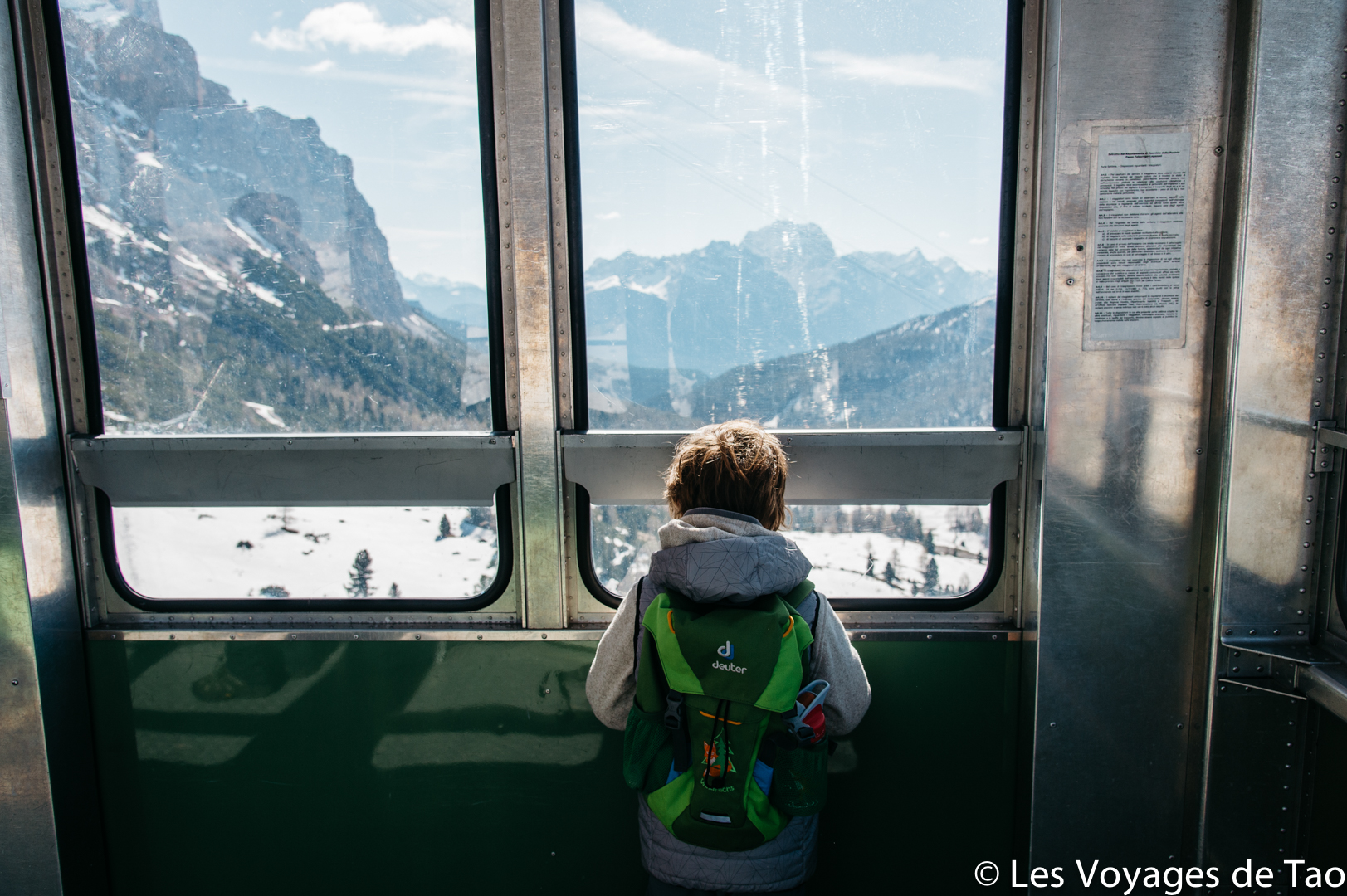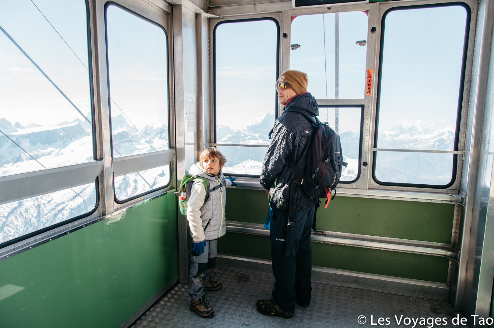 Le matin nous avons pris le téléphérique, gratuit pour Tao, 16 euros par adulte. Ne pas faire en cas de vertige, c’est très haut ! De là haut la vue est superbe, nous sommes à plus de 2700 mètres d’altitude et encore une fois grâce à cette neige la vue est à couper le souffle, on se serait cru sur un sommet à 4000 mètres d’altitude ! Nous avons marché 10 minutes dans la neige, Tao a joué, c’était sublime.